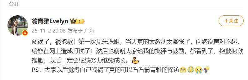 刚刚,翁清雅给朱珠道歉了。闯祸了,很抱歉!第一次见朱珠姐,当天真的太激动太紧张了,向您说声对不起,给您在网上造成打扰了!然后也谢谢大家给我的批评与鼓励,都看到了,抱歉抱歉抱歉,以后一定会继续努力继续成长。PS:大家以后觉得自己闯祸了真的可以看看翁青雅的探访